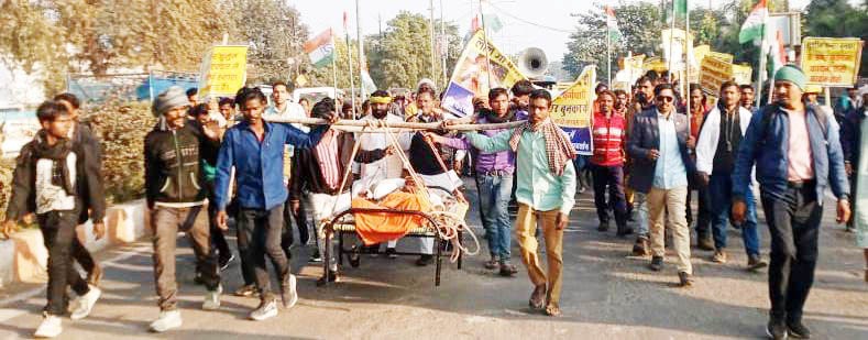 Singrauli News: पीड़ित लालजी बैगा को चारपाई पर लेकर कांग्रेसियों ने निकाली रैली