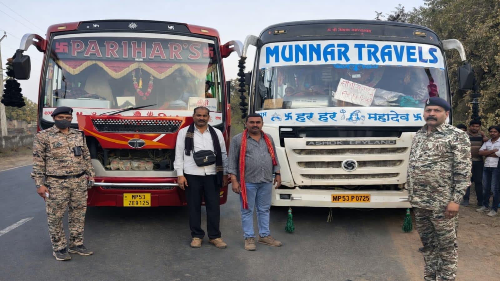 जाँच के दौरान 02 बसें नियमविरुद्ध आवागमन करती पाई गईं, जिन पर चालानी कार्रवाई की गई। संबंधित वाहन क्रमांक MP53 ZE 9125 एवं MP53 P 0725 के चालकों को जनजागरूकता मिशन के तहत नियमों का पालन करने की समझाइश भी दी गई।