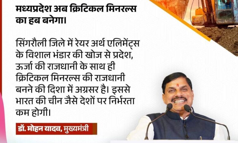 भोपाल सिंगरौली में दुर्लभ पृथ्वी तत्वों (रेयर अर्थ एलिमेंट्स) का बड़ा भंडार मिला है। मुख्यमंत्री डॉ. मोहन यादव ने कहा कि इस खोज से भारत की चीन पर निर्भरता कम होगी और प्रदेश “क्रिटिकल मिनरल्स हब” के रूप में उभरेगा। इन खनिजों से हरित ऊर्जा, इलेक्ट्रिक वाहन और हाई-टेक उद्योगों में आत्मनिर्भरता मिलेगी। केंद्रीय कोयला और खनन मंत्री जी. किशन…