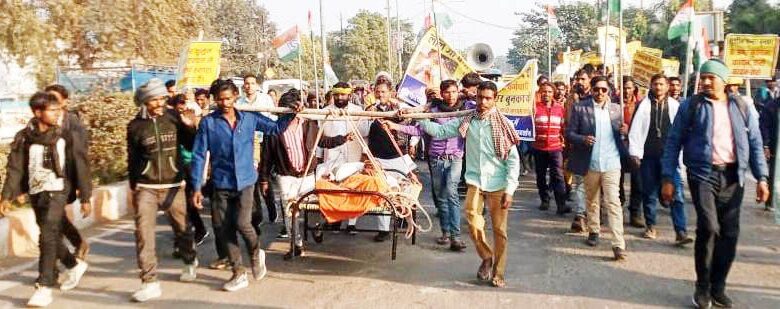 Singrauli News: पीड़ित लालजी बैगा को चारपाई पर लेकर कांग्रेसियों ने निकाली रैली